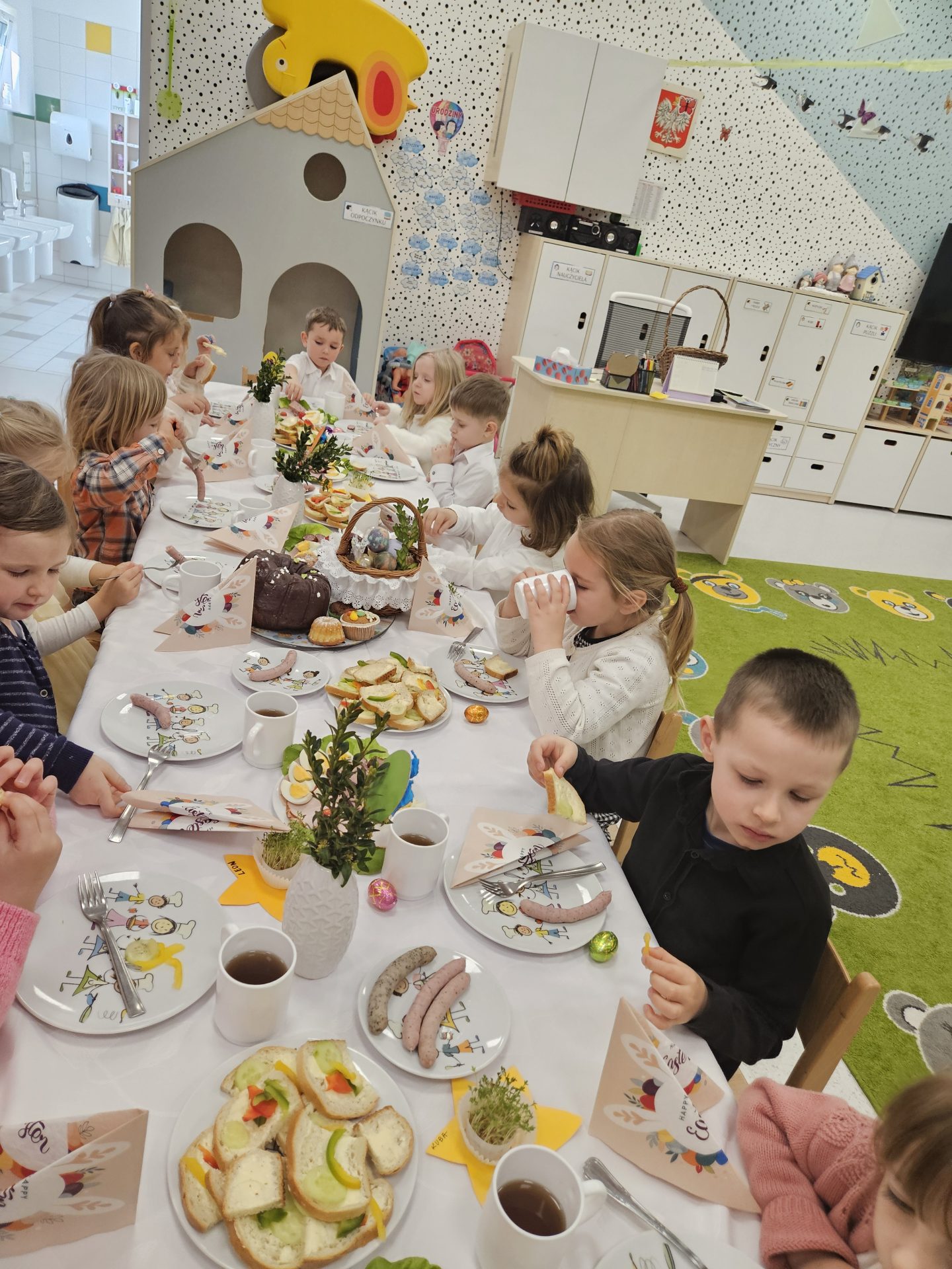 Święta Wielkanocne są w tradycji chrześcijaństwa najważniejszymi świętami w roku. Wraz z wiosną, odradzającym się życiem niosą nadzieję i radość. Przygotowaliśmy więc tradycyjne śniadanie świąteczne ze wspólnie przyniesionych przez dzieci przekąsek. Razem przygotowaliśmy koszyczek do święcenia pokarmów, omawiając ich symbolikę. Śmigus-dyngus zaskoczył dzieci i rozbawił. Odwiedziła nas Pani Wójt oraz zajączek z upominkami. Wspólne śniadanie i pyszne babeczki uwieńczyły świąteczny nastrój.