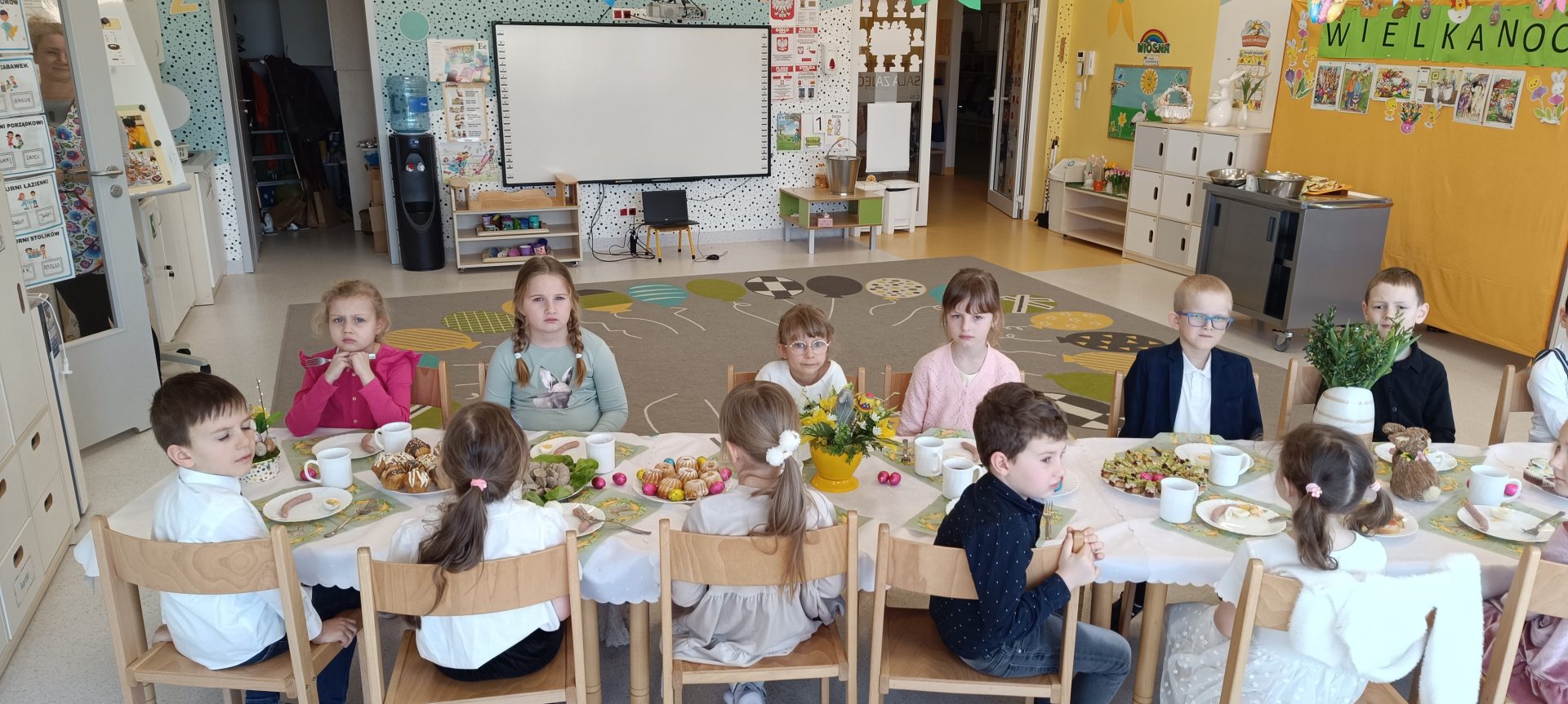 Wielkanoc to najstarsze i najważniejsze święto chrześcijańskie, mające bogatą tradycję i liczne religijne obrzędy. Jednym z nich jest uroczyste śniadanie, które poprzedza składanie sobie życzeń. Również w naszym przedszkolu ta tradycja jest kultywowana. W grupie Pszczółek na stole pojawiły się tradycyjne wielkanocne przysmaki – jajka, babka, szynka. Nie zabrakło także symboli wielkanocnych oraz pięknych stroików z bazi i bukszpanu oznaczających przyrodę, która budzi się do życia. Podczas spotkania przedszkolaki śpiewały piosenki związane z tematyką wiosenno-świąteczną. Wspólne, uroczyste śniadanie wywołało miłe i niezapomniane doznania, które na długo pozostaną w pamięci wszystkich wychowanków. Dziękujemy rodzicom za upieczenie babki wielkanocnej , za stworzenie koszyczka wielkanocnego i za inne potrawy wielkanocne oraz za piękne ozdoby wielkanocne.