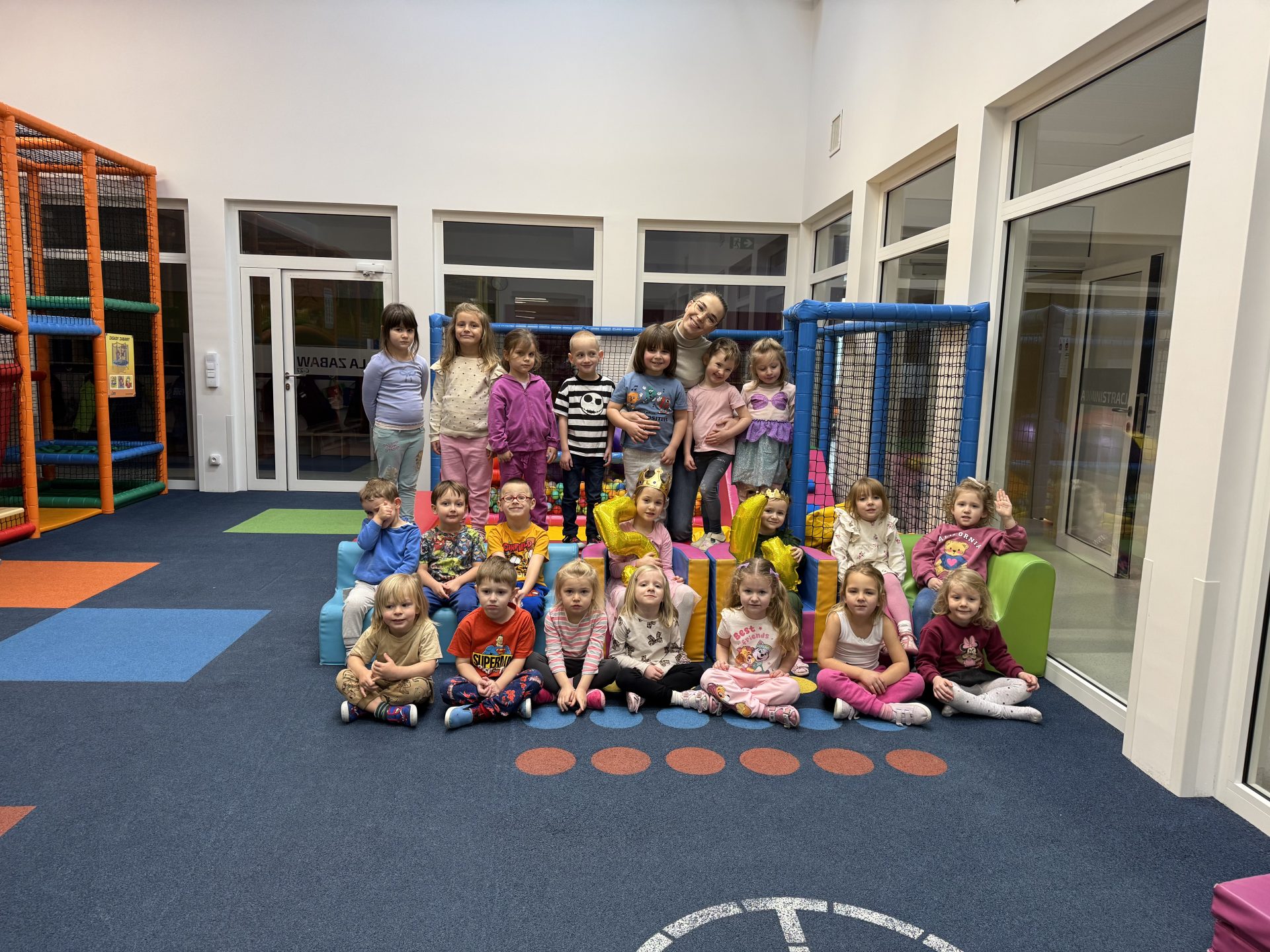 W samym centrum przedszkola znajduje się wewnętrzny plac zabaw ”Małpi Gaj”, który swoją wielkością oraz kolorami zachęca dzieci do zabawy.